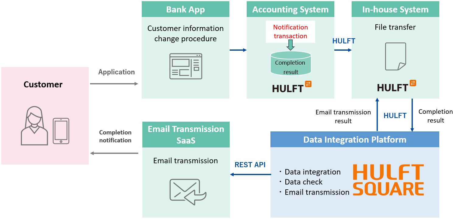 The Bank of Saga Ltd. utilized HULFT Square to integrate its mobile app, accounting system, internal operations, and email services into a seamless workflow. When a customer submits a change via the app, the information is extracted, validated, and automatically routed to the appropriate system. Batch processing verifies data consistency before sending completion emails via the SaaS platform. If any issue is detected, alerts are routed back internally.