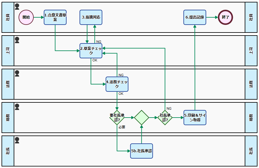 上司のチェックと法務によるチェックを経て、他社との合意文書を作成する業務フローですが、こちらでは社長によるチェックでNG(戻し)が発生する場合が十分あることが前提となっています。