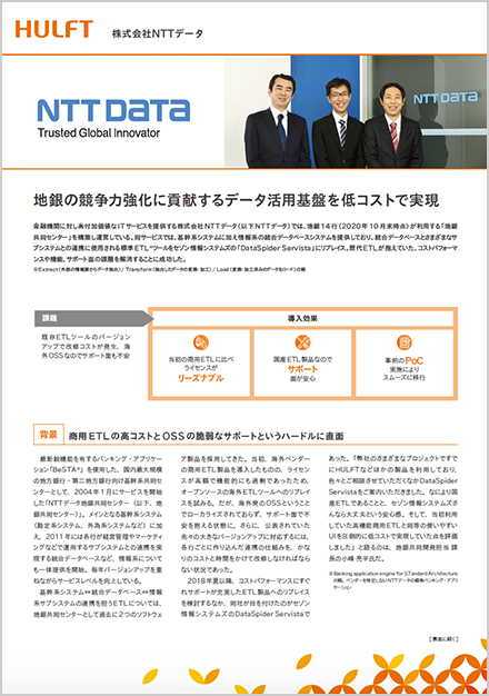 金融機関に対し高付加価値なITサービスを提供する株式会社NTTデータ(以下NTTデータ)では、地銀14 行(2020 年10 月末時点)が利用する「地銀 共同センター」を構築し運営している。同サービスでは、基幹系システムに加え情報系の統合データベースシステムを提供しており、統合データベースとさまざまなサ ブシステムとの連携に使用される標準ETL※ツールをセゾン情報システムズ(現セゾンテクノロジー)の「DataSpider Servista」にリプレイス。歴代ETLが抱えていた、コストパフォーマ ンスや機能、サポート面の課題を解消することに成功した。