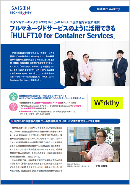 プロセス最適化支援を中心に、各種サービスを展開している株式会社Workthyでは、各金融機関から国税庁に提供が必要なNISA口座に係る買付(簿価)残高情報を送受信する認定クラウドサービスとして「NISAクラウドサービス」を運営している。この「NISAクラウドサービス」とファイル連携するためのインターフェースとして、コンテナオーケストレーションサービスに対応した「HULFT10 for Container Services」を採用した。