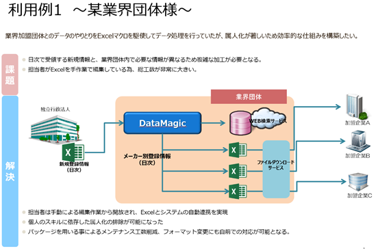 日常的に発生しがちなExcelのデータ統合ですが、DataMagicを用いることで複雑なデータ加工やデータ処理をシンプルに行うことができます。Excelファイル内のデータを加工したうえで加盟企業ごとにデータ変換してExcel出力する業界団体の事例や、桁数違いや半角・全角の混在など取引先ごとにExcel内のデータ様式が異なるものを自動的にデータクレンジングして活用している流通・小売企業の事例など、DataMagicによってデータ変換を容易に実施している成功事例が数多くあります。