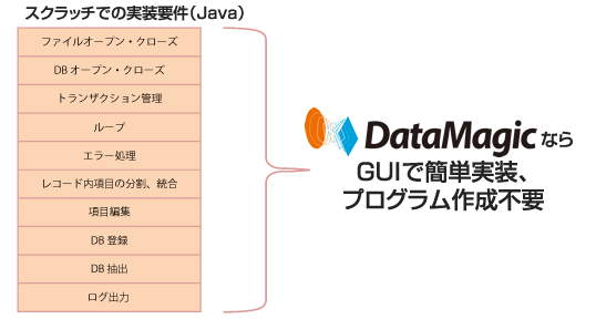 DataMagicであれば、GUIを用いてすべての処理が定義でき、わずか1日程度でファイルからDB登録までの処理が実装できます。Javaでの実装なら5人日程度は必要ですが、DataMagicなら5分の1程度の工数で簡単に実装できます。データ加工やデータ変換処理に特化したDataMagicを用いることで、業務部門の要求に迅速に対応できるようになります。