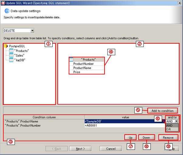 | (6) | Add to condition | Add the column selected in the write table to the condition column. | |