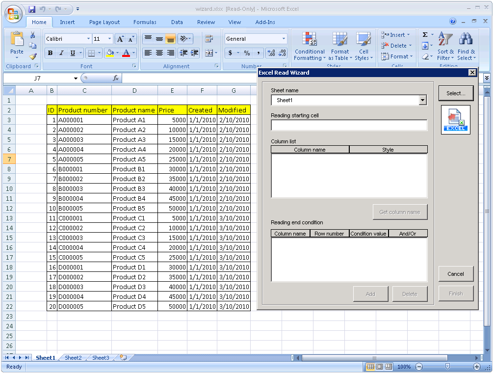 | Cancel | "Excel Read Wizard" dialog closes. |