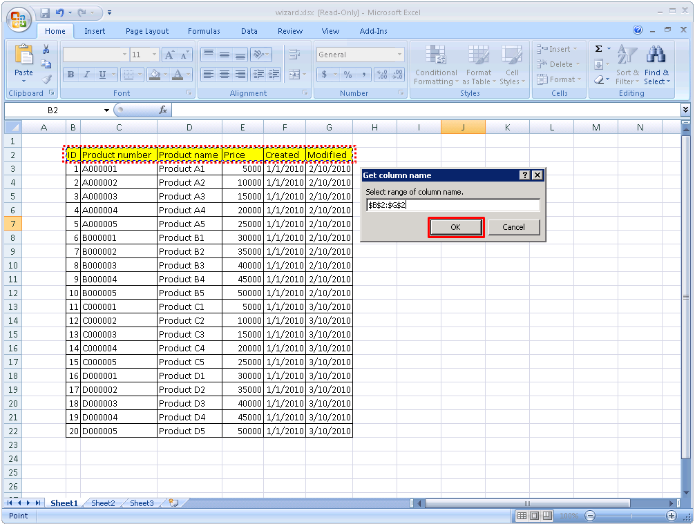 Column name can be specified by one row of cells that has the same column number with the selected range in [Select range of reading] dialog.