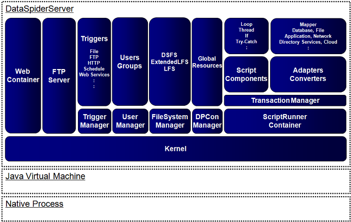 DataSpiderServer's architecture can be broadly separated into the kernel and the managers.Kernel is the core component of DataSpiderServer and is responsible for starting/stopping and registering/unregistering of each manager.
