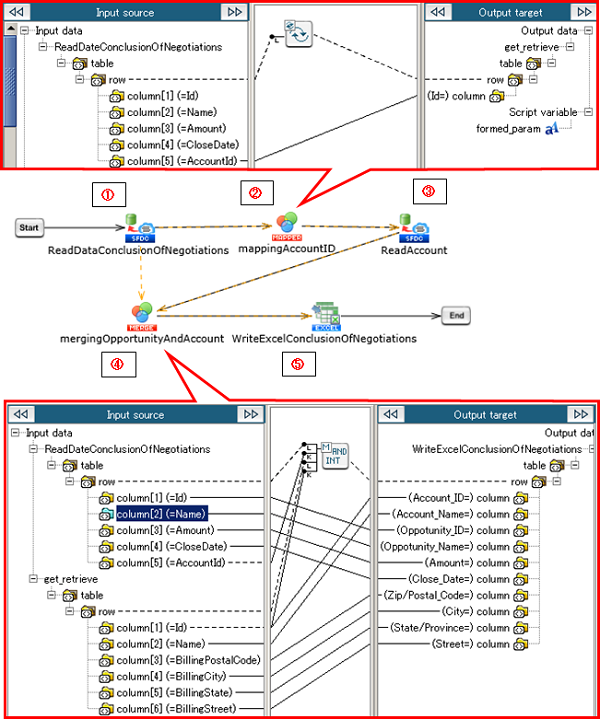 Using Mapper, maps the Account ID of the Opportunity data read in (1), to a succeeding process. |