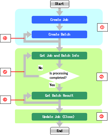 Until the process is completed ,the job/batch information obtainment will repeat at intervals of the [Batch monitoring intervals (sec)], of the [Bulk Operation Settings] tab. |