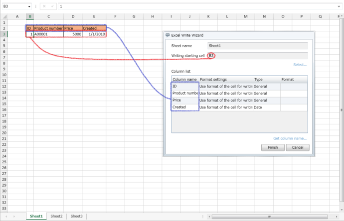 | Finish | "Excel Write Wizard" settings screen is closed, and the setting items of the wizard is reflected to the properties of Write. |