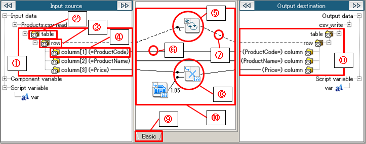 (7) Mapping link(dotted line) The repetition of the data extraction is shown. It means the repeated data is read in the place where the link is connected. It is used by the repetition logic and merging logic.