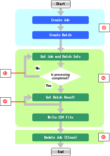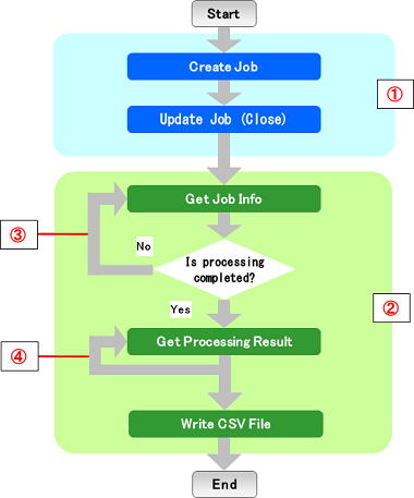 Until the process is completed ,the job/batch information obtainment will repeat at intervals of the [Batch monitoring intervals (sec)], of the [Bulk Operation Settings] tab. |