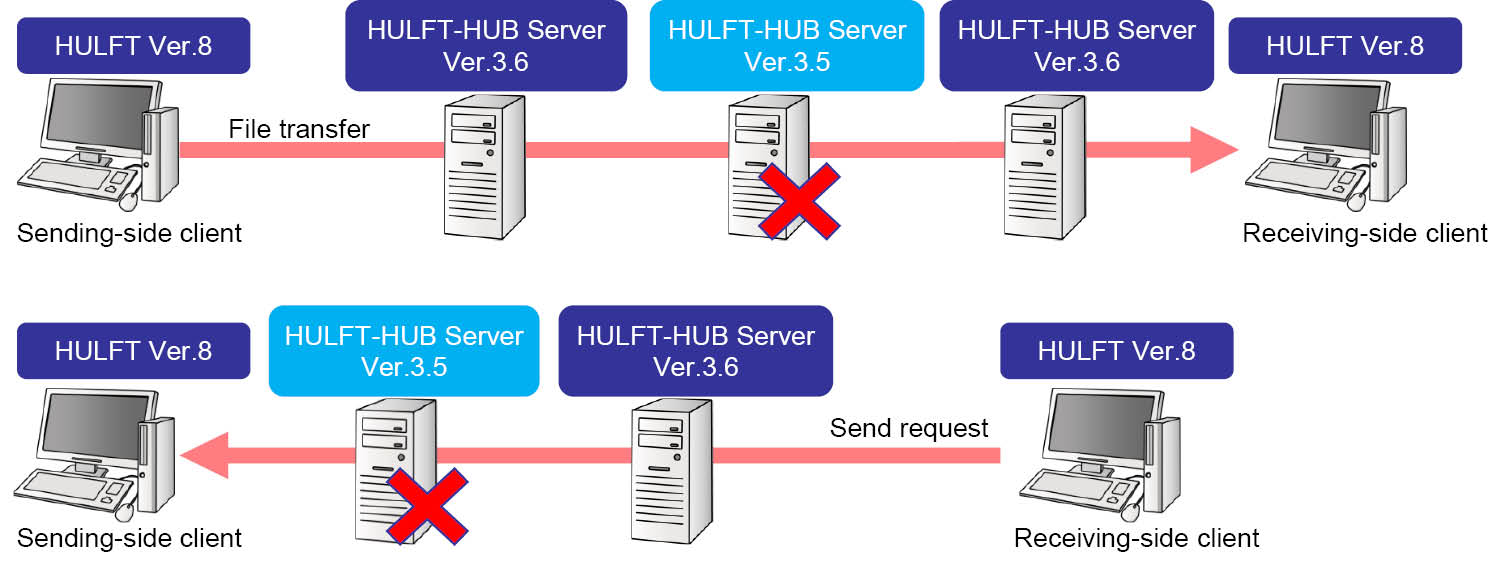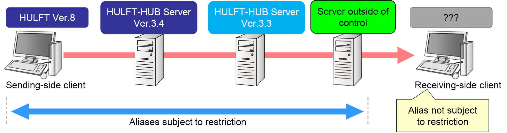 If there servers or clients are hidden from the HULFT-HUB system because, for example, a file transfer operation is routed through a server outside of control, those aliases are not related to these restrictions.