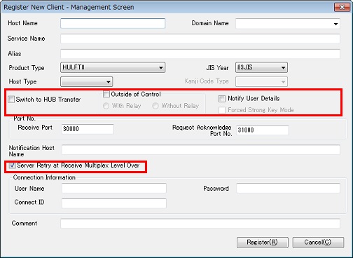 If you specify a code set that is not Japanese for the Code Set for Transfer (cs4trnsfr) on the client, HULFT-HUB Manager does not use the value that is specified for the JIS Year on the Client Registration (New Registration) dialog box.