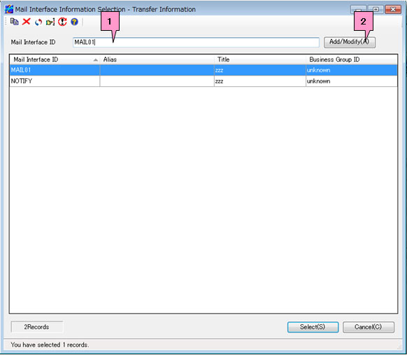 When you modify a record, enter the mail interface ID of the record in the Mail Interface ID on the Select Mail Interface Information Record screen or select the relevant ID in the list, and then click the [Add/Modify] (marked as 1 and 2, respectively, on the screen below).
