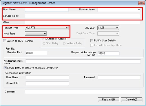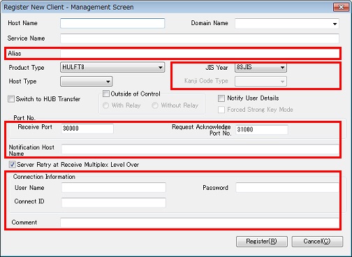 | If you specify a code set that is not Japanese for the Code Set for Transfer (cs4trnsfr) on the client, HULFT-HUB Manager does not use the value that is specified for the JIS Year on the Client Registration (New Registration) dialog box. | |