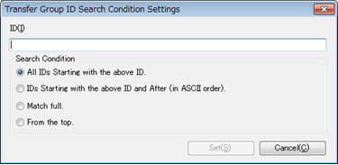 On the Transfer Group ID Search Condition Settings dialog box, you can specify conditions for filtering transfer group IDs that appear in the list on the Transfer Group Information List screen.