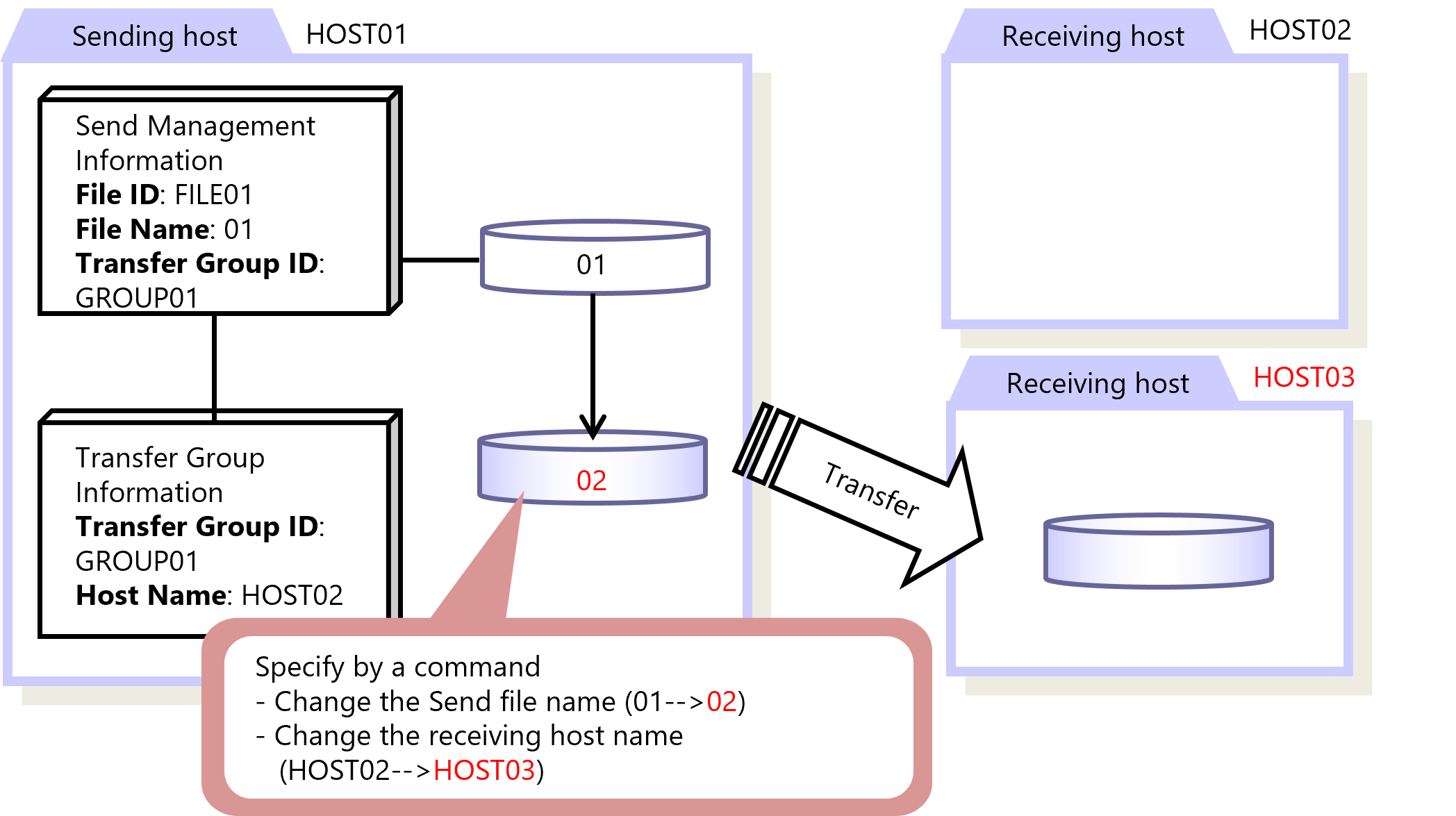 If you use this function for sending-side transferring, you can dynamically change the name of the send file and the name of the receiving-side host. Therefore, you can dynamically change transfer conditions with a single file ID, in cases such as when the file name or sending destination changes on a per-transfer basis.