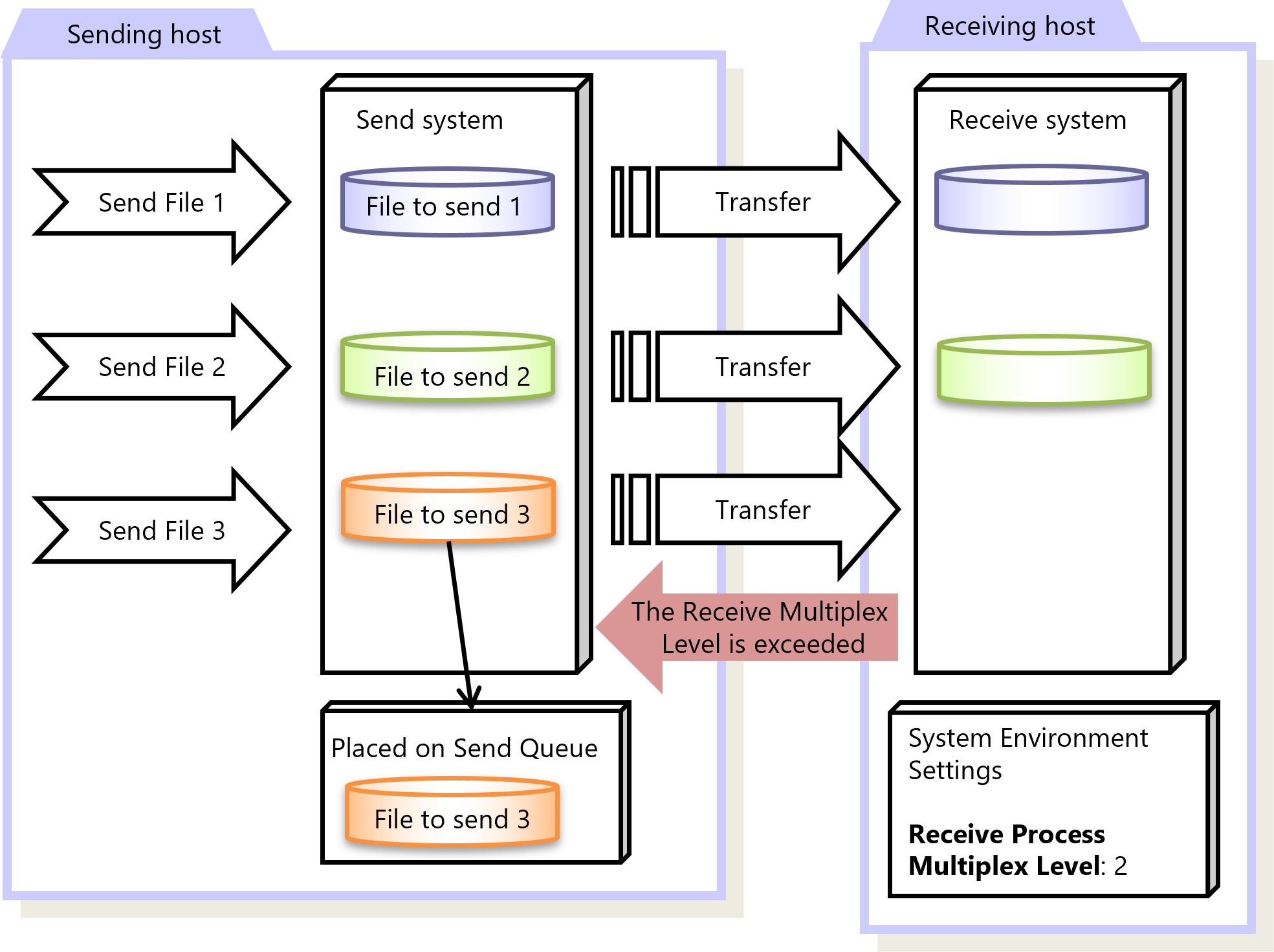 When the number of transfers exceeds the Receive Multiplex Level, the transfers are treated as a Receive Multiplex Level error and connection to the host on the sending side is disconnected.