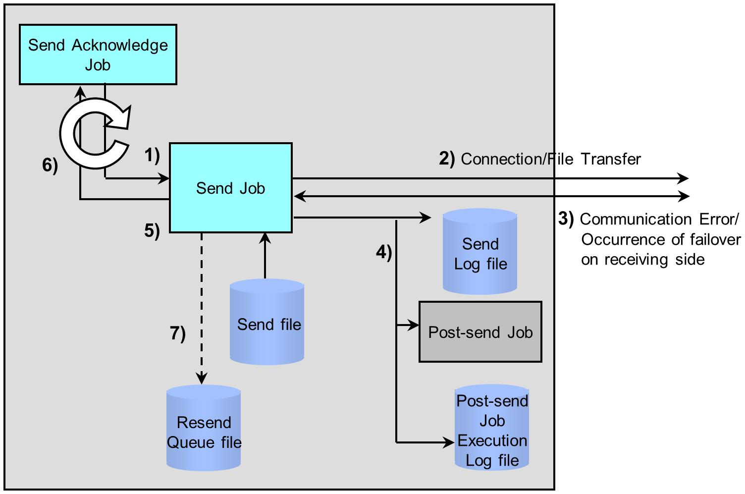 • When an error occurs in 3) , the receiving host carries out end-of-job processing and ends the job. If the job on the sending side reconnects HULFT due to auto resending, the job on receiving side will be regenerated.