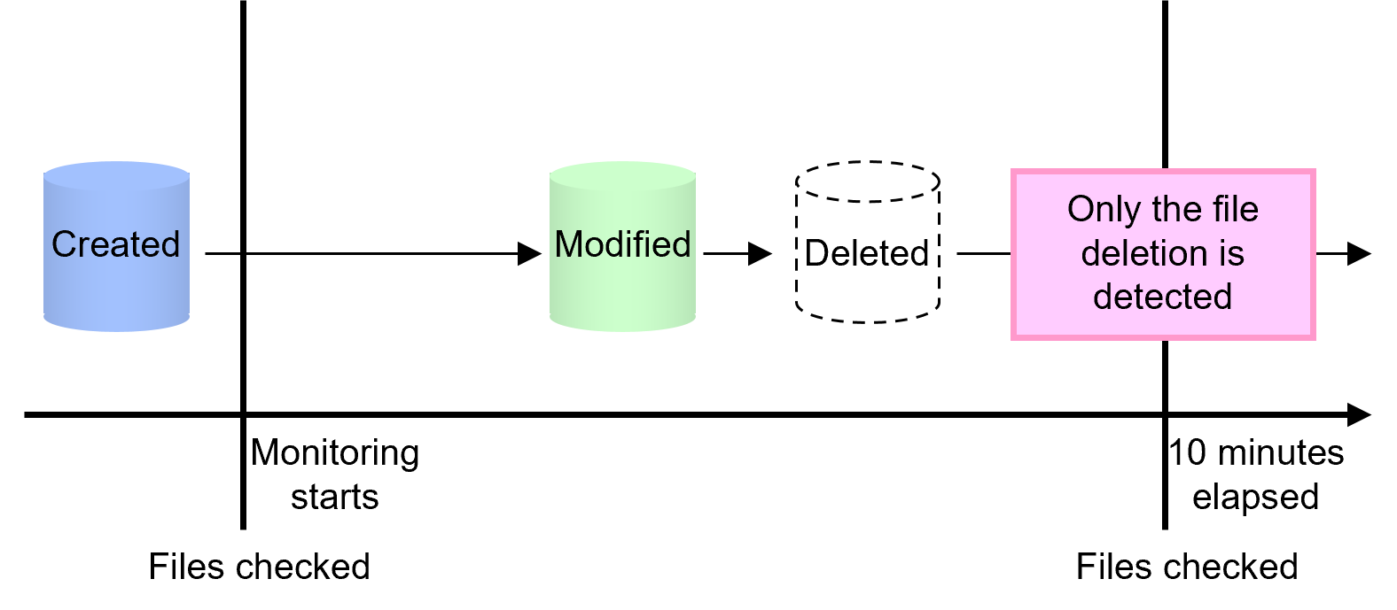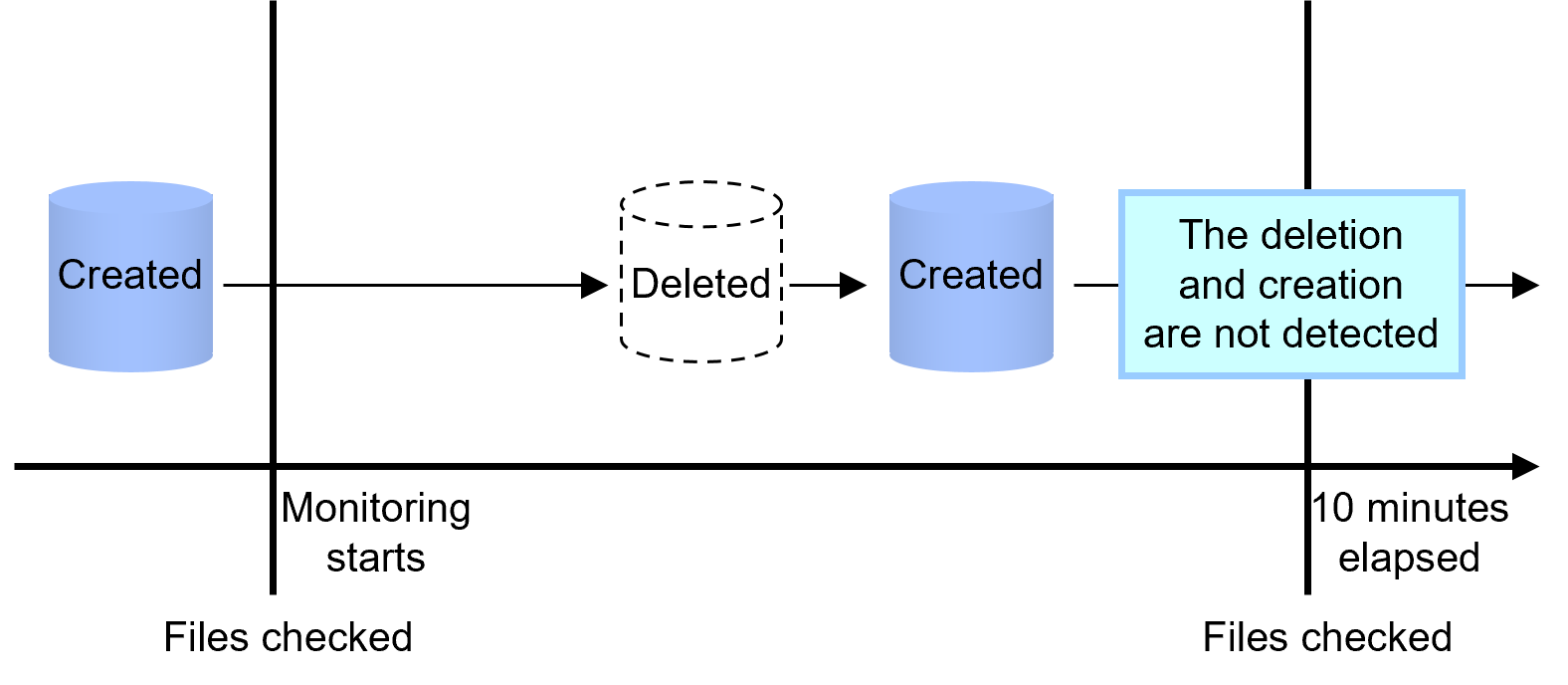 Creation and deletion are detected only after monitoring starts, because monitoring is performed based on the file status at the time when monitoring started.