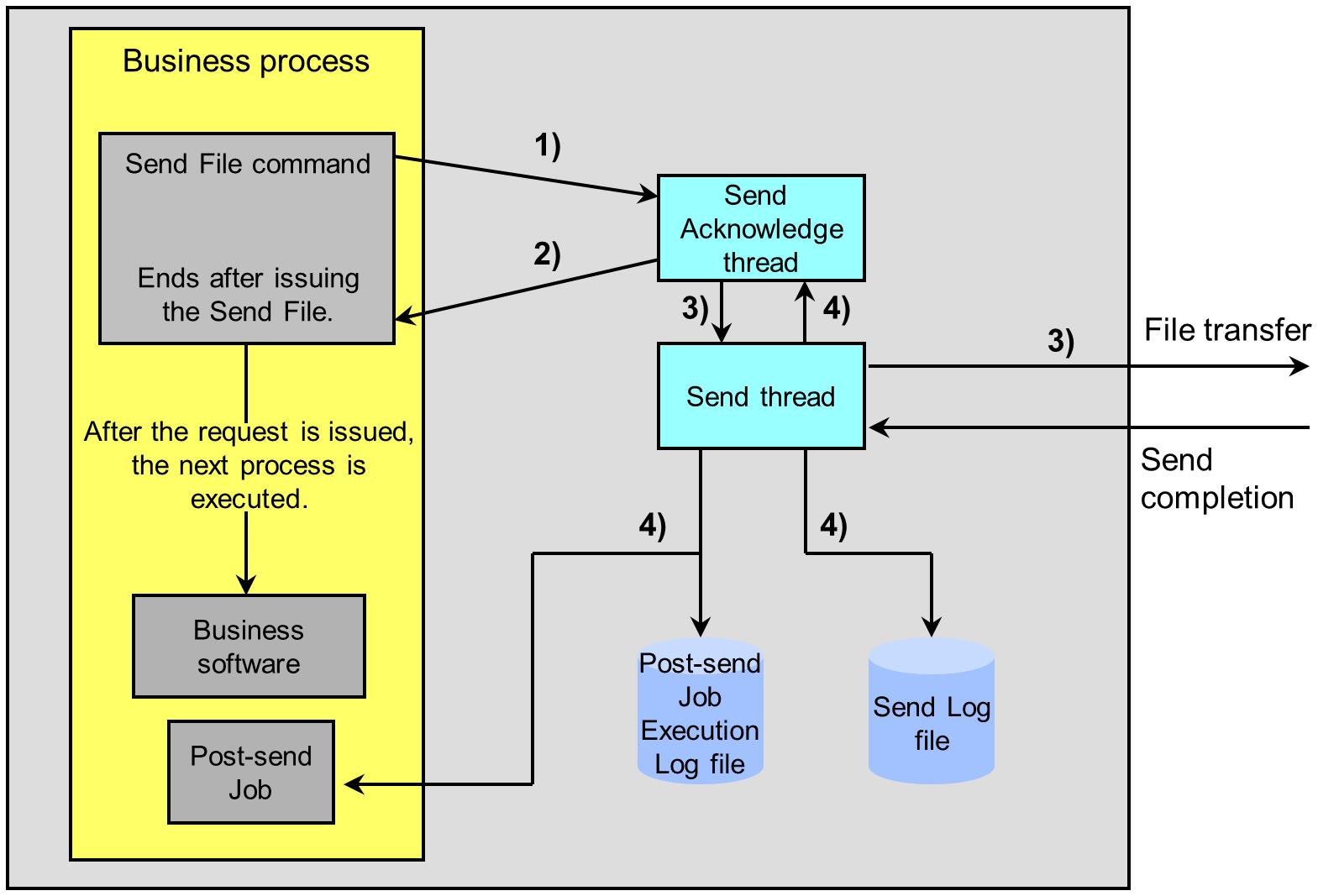 After completing the Send processing, the Send thread notifies the Send Acknowledge thread of the result of the file transfer and writes the result to the Send Log file (hulsndlog.db). In addition, the Send thread starts the job that is registered as a Post-send Job.