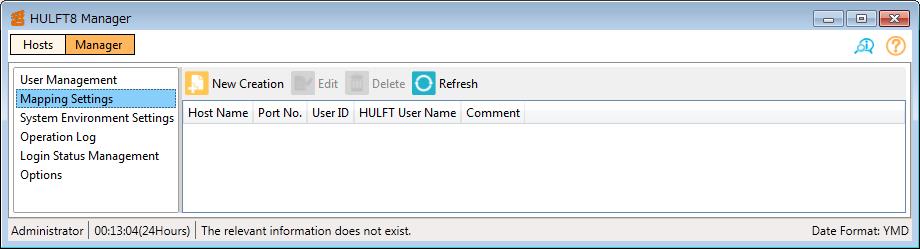 On HULFT Manager main screen, click the Manager tab, and on the Manager menu, click Mapping Settings. The Mapping Settings screen appears.