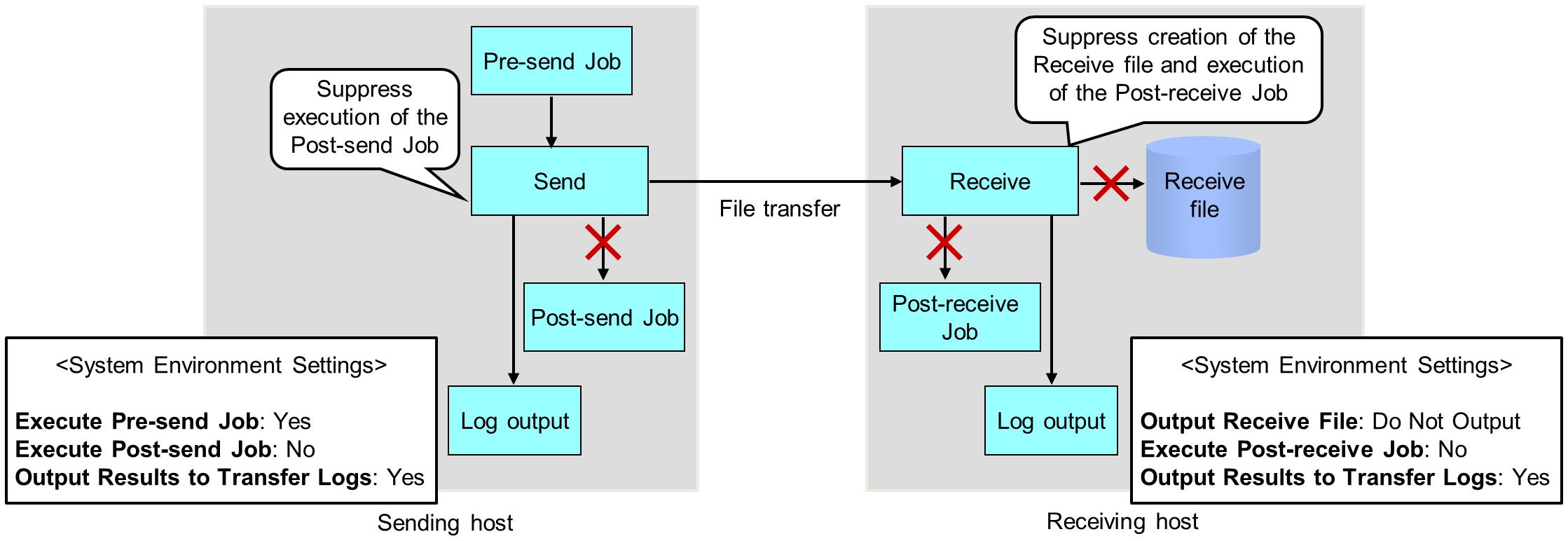 When you set the output of receive files to be suppressed in the System Environment Settings, in Transfer Test, you cannot check the operations that assume the existence of the receive files such as subsequent jobs. Even if the transfer ends successfully in test operation, the transfer may fail in normal operation.