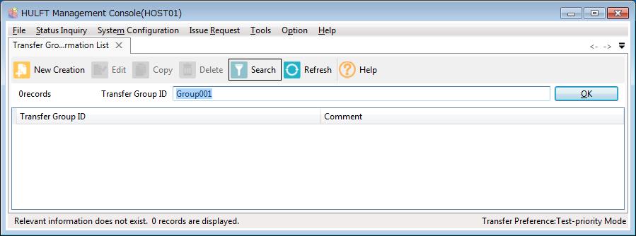 On the HULFT Management Console, Click System Configuration > Transfer Group Information. The Transfer Group Information List screen appears.