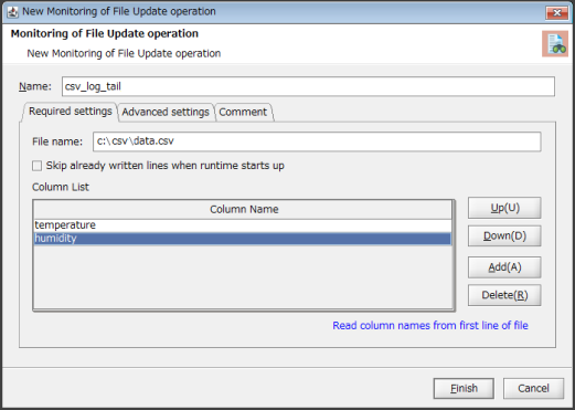 To retrieve Column Name from the first line of the CSV file, click Read column names from first line of file, and select the file.