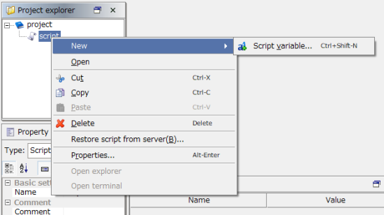Right-click a script in Project Explorer and select New > Script variable from the menu.