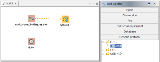 Drag and drop Generic protocol > HTTP > Send from the tool palette onto the script canvas.