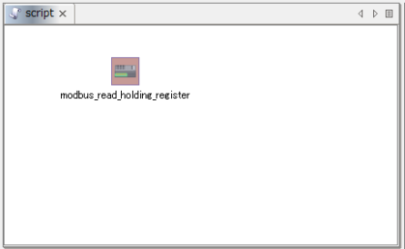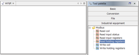 Drag and drop Industrial equipment > Modbus > Read holding registers from the tool palette onto the script canvas.