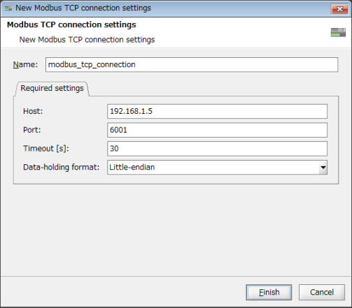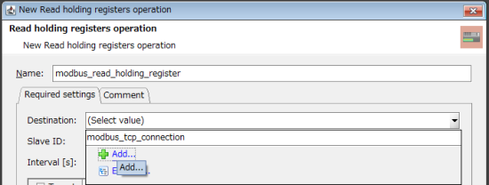 Click Add in the connection destination list to display the New Modbus TCP connection settings dialog box.
