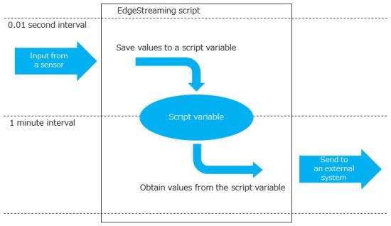 For example, if data is input from a sensor at an interval of 0.01 seconds, and that data is sent to an external destination at the same interval, there is a danger of the data volume becoming excessively large. As a countermeasure, create the following streams in one script.
