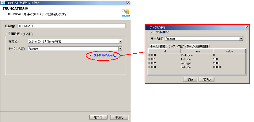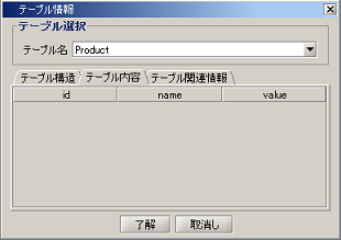 | テーブル情報の表示 | [接続先]で指定したデータベースに含まれるテーブルの構造、内容、関連情報を表示します。 テーブル情報については「テーブル情報」を参照してください。 |