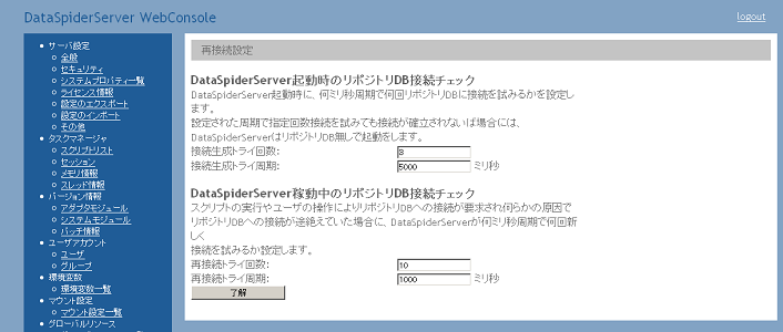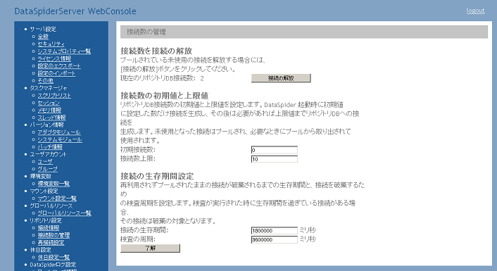 リポジトリへの接続数を表示・変更します。またプールされている未使用の接続を解放することができます。