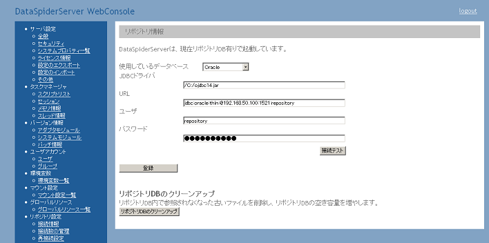 リポジトリの接続情報を表示・変更します。またリポジトリDB有りの環境では、リポジトリのクリーンアップを行うことができます。