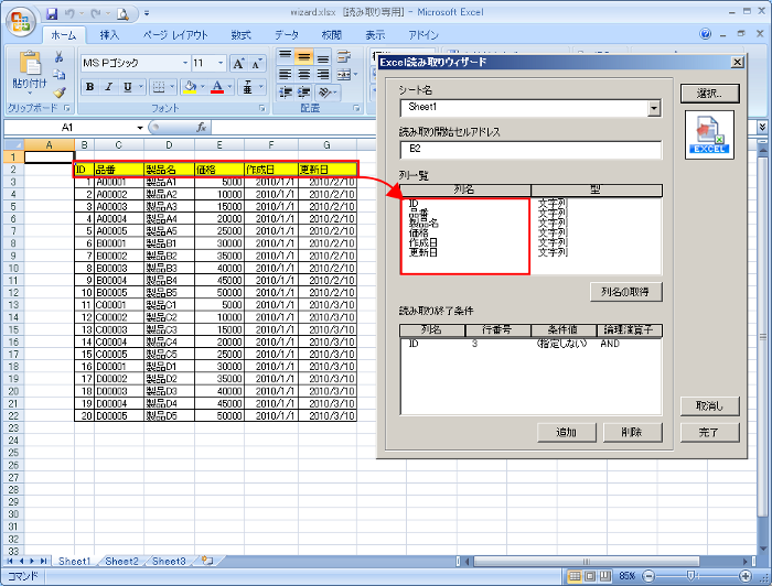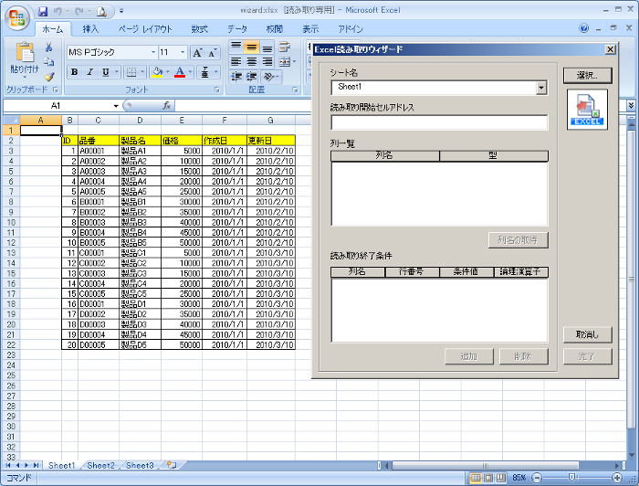 | シート名 | 選択中のシート名です。 「Excel読み取りウィザード」設定画面のシート名を変更すると、Excelアプリケーションで表示されているシートが変更されます。 |