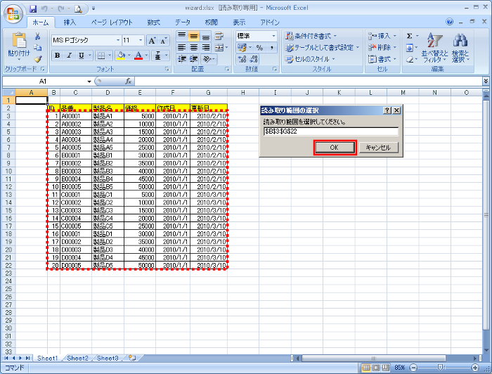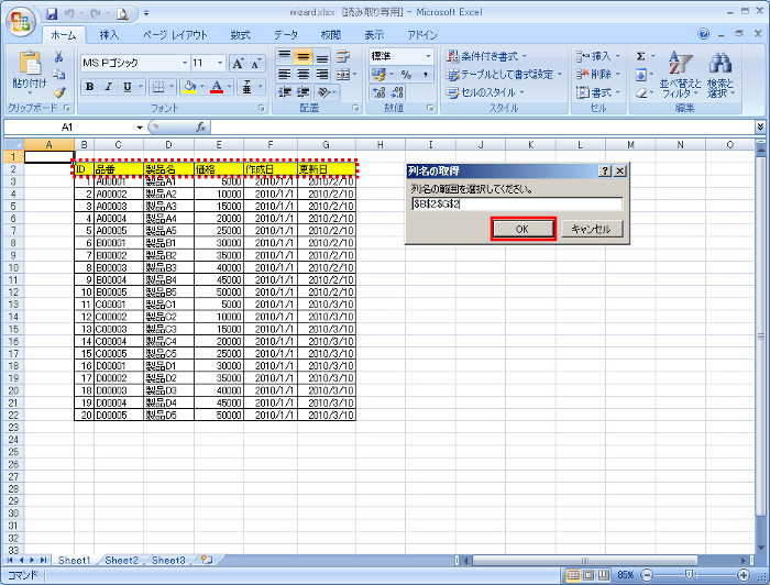 「読み取り範囲の選択」ダイアログで選択した範囲と同じ列数のセル一行分を列名に指定できます。