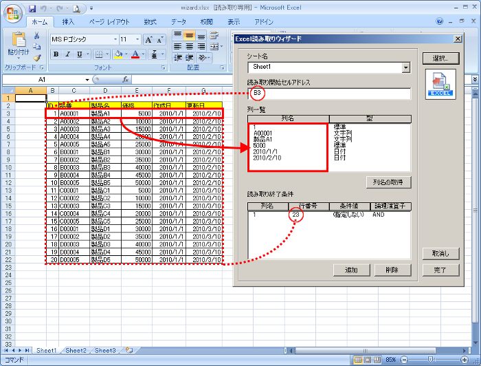 | 読み取り開始セルアドレス | 選択した読み取り範囲の開始セル |