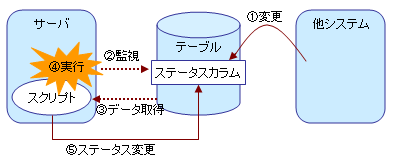DBトリガーは、指定したデータベースのテーブルを監視し、ステータスカラムの値の状態によってスクリプトを実行するトリガー機能です。