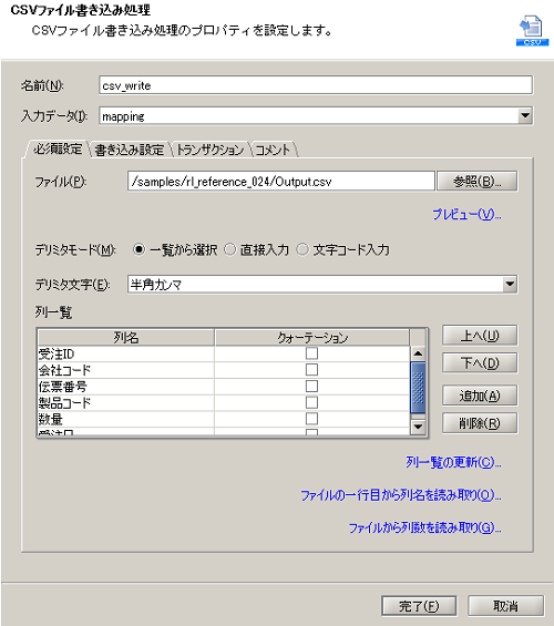 - CSVファイル書き込み処理の設定は、以下のように行います。
