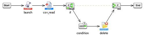 - 「条件分岐処理」で実行中のスクリプト数を判定し、実行中のスクリプトがない場合、「ファイル/ディレクトリ削除処理」で作業ファイルを削除します。