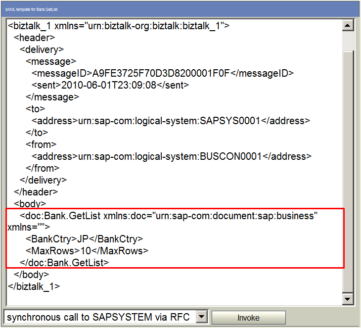 <?xml version="1.0" encoding="Shift_JIS"?> <doc:Bank.GetList xmlns:doc="urn:sap-com:document:sap:business" xmlns=""> <BankCtry>JP</BankCtry> <MaxRows>3</MaxRows> </doc:Bank.GetList> |