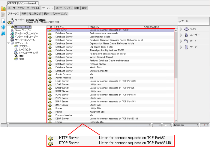 Dominoサーバで以下のタスクが起動していることを確認します。