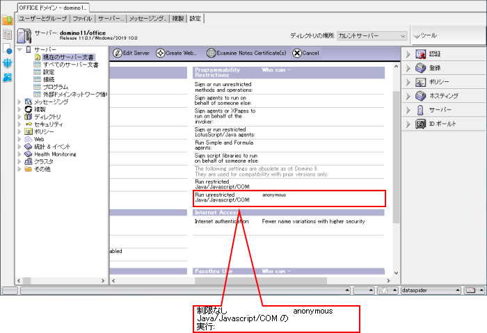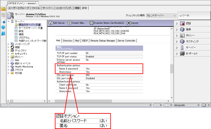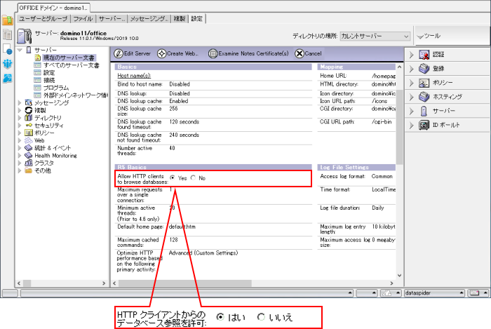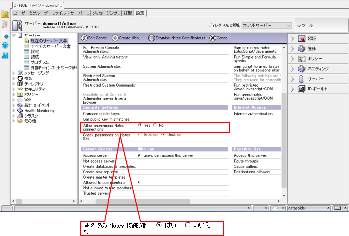 不特定のユーザで接続する場合には、「匿名でのNotes接続を許可」の項目で「はい」を選択します。