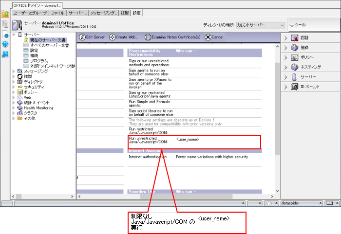 特定のユーザで接続する場合には、「制限なしJava/JavaScript/COMの実行」の項目でユーザ名を追加します。