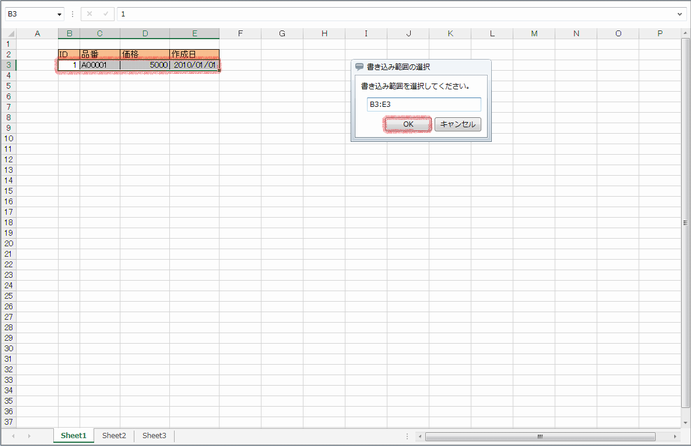 | シート名 | 書き込み範囲の選択で選択したシート名が表示されます。 |