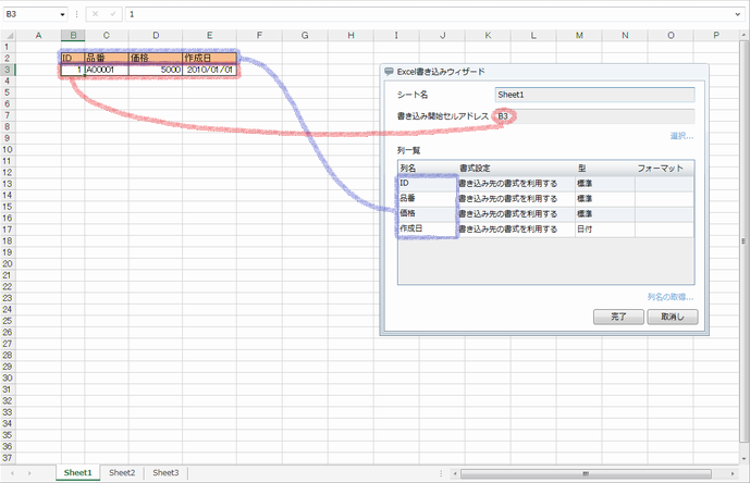 | 完了 | 「Excel書き込みウィザード」設定画面を閉じ、書き込み処理のプロパティにウィザードの設定項目を反映させます。 |
