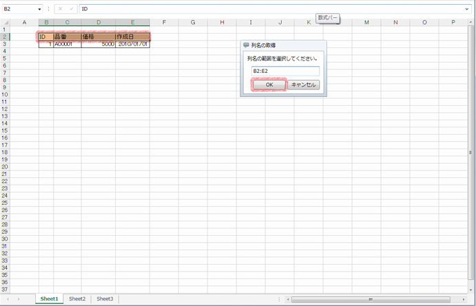 | 列名の取得 | 「列名の取得」ダイアログが表示されます。 |